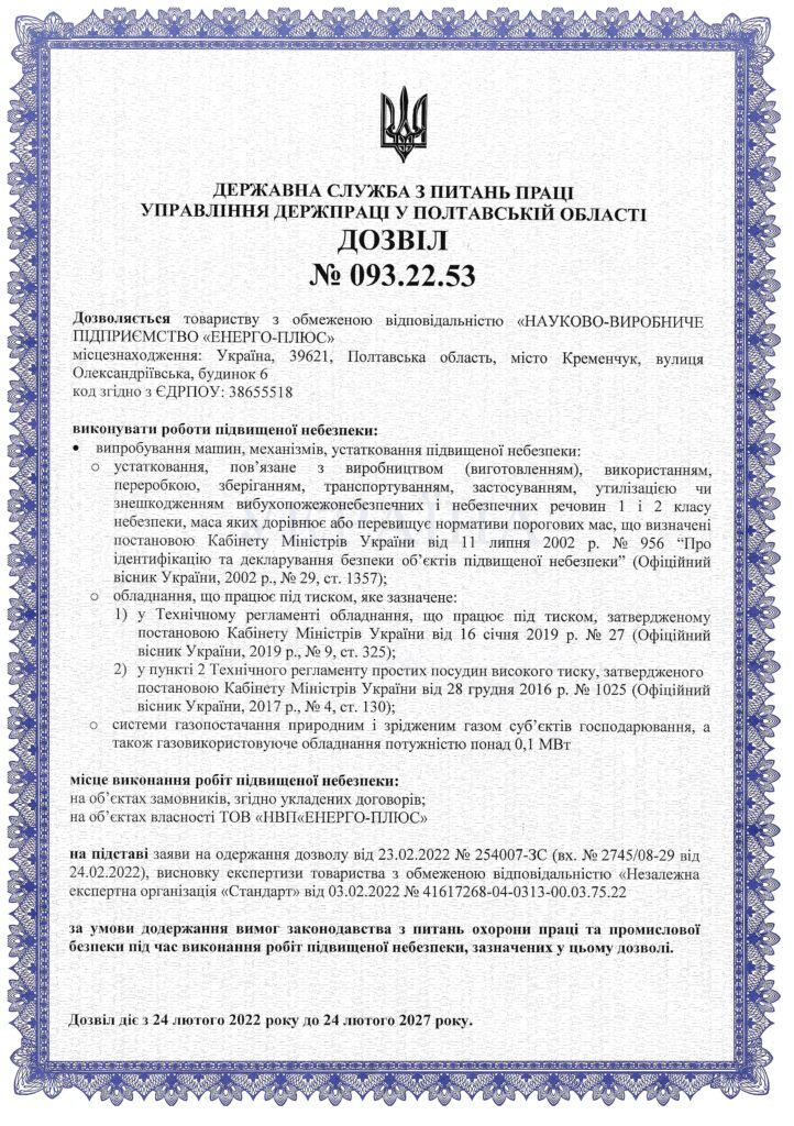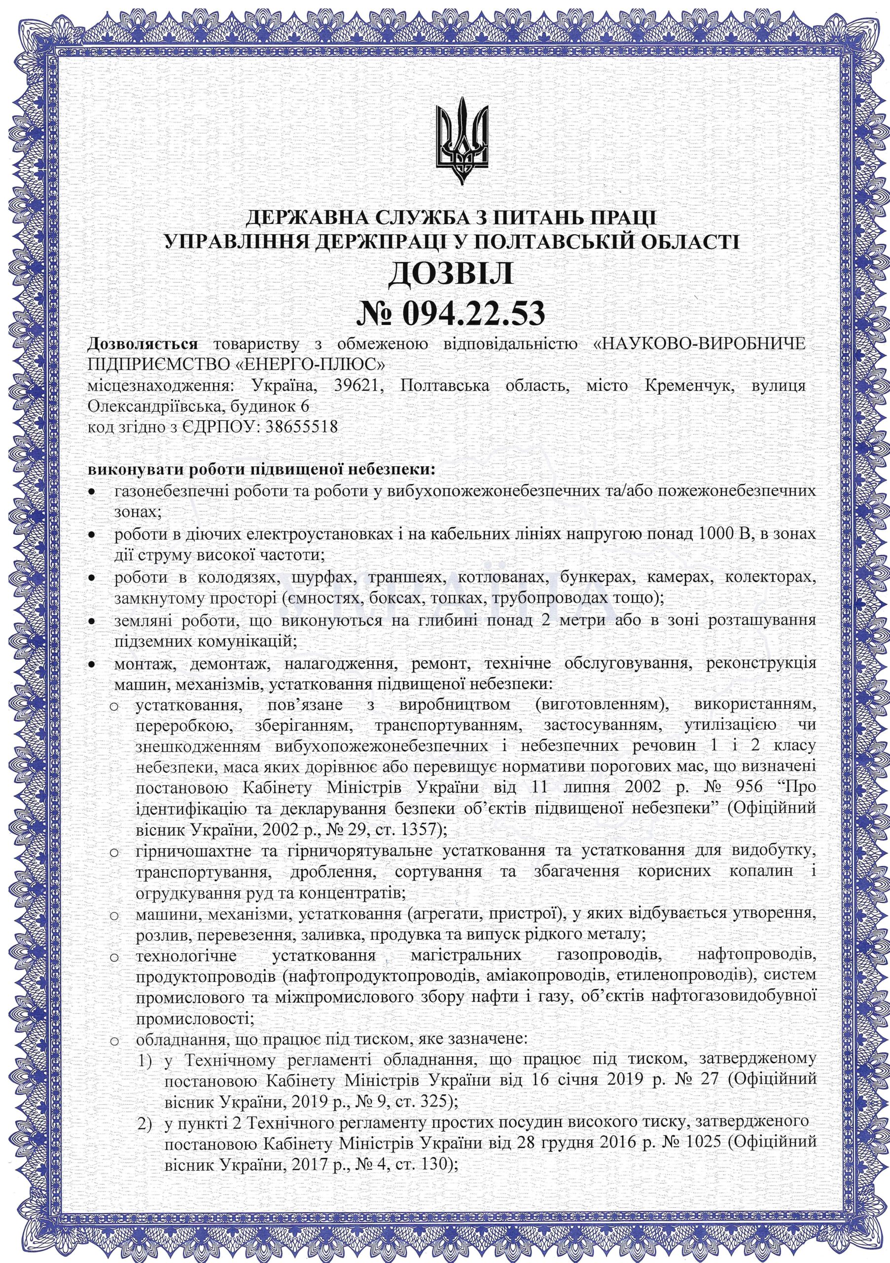 Дозвіл на виконання робіт підвищеної небезпеки № 094.22.53