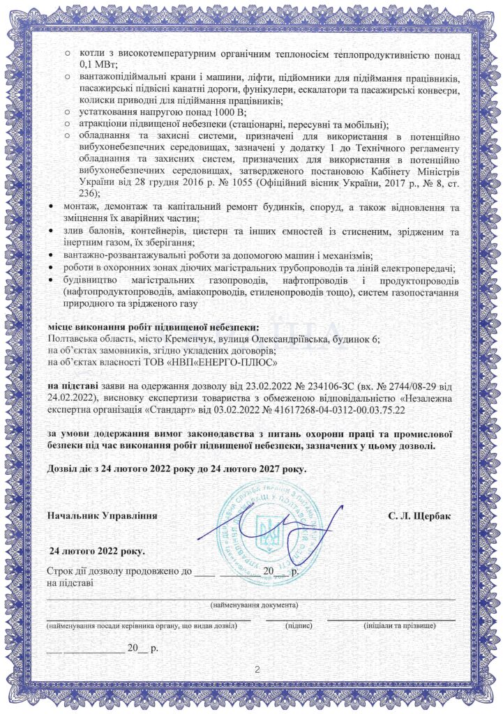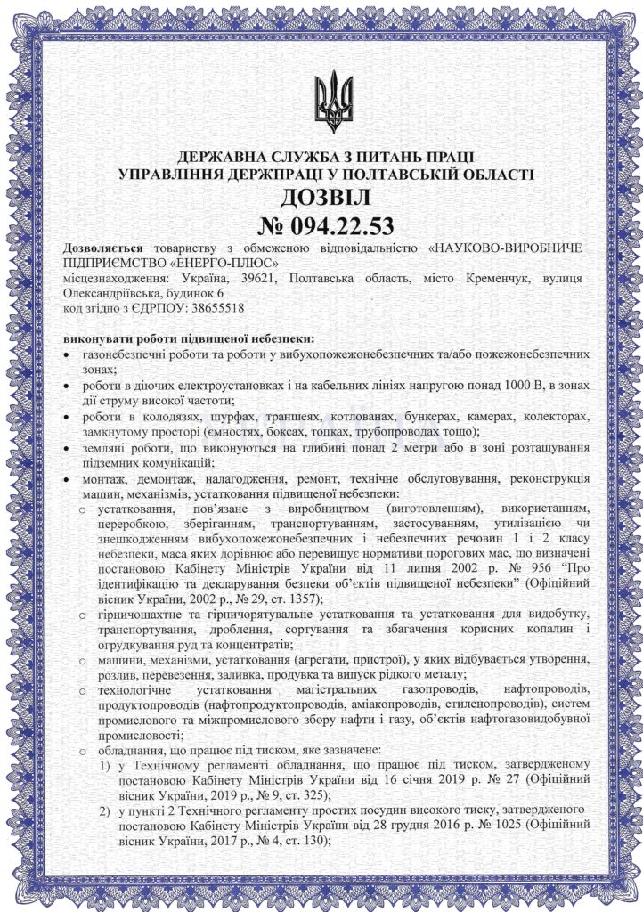 - дозвіл на виконання робіт підвищеної небезпеки (газонебезпечних робіт та робіт у вибухопожежонебезпечних та/або пожежонебезпечних зонах; роботи в діючих електроустановках і на кабельних лініях напругою понад 1000 В, в зонах дії струму високої частоти; роботи в колодязях шурфах, траншеях, котлованах, бункерах, камерах, колекторах, замкнутому просторі; земляні роботи що виконуються на глибині понад 2 метри або в зоні розташування підземних комунікацій; монтаж, демонтаж, налагодження, ремонт, технічне обслуговування реконструкція машин, механізмів, устаткування підвищеної небезпеки; монтаж, демонтаж та капітальний ремонт будинків, споруд, а також відновлення та зміцнення їх аварійних частин; злив балонів, контейнерів, цистерн та інших ємностей із тисненням, зрідженим та інертним газом та їх зберігання; вантажно-розвантажувальні роботи за допомогою машин та механізмів; роботи в охоронних зонах діючих магістральних трубопроводів та ліній електропередачі; будівництво магістральних газопроводів, нафтопроводів і продуктопроводів, систем газопостачання природного та зрідженого газу);