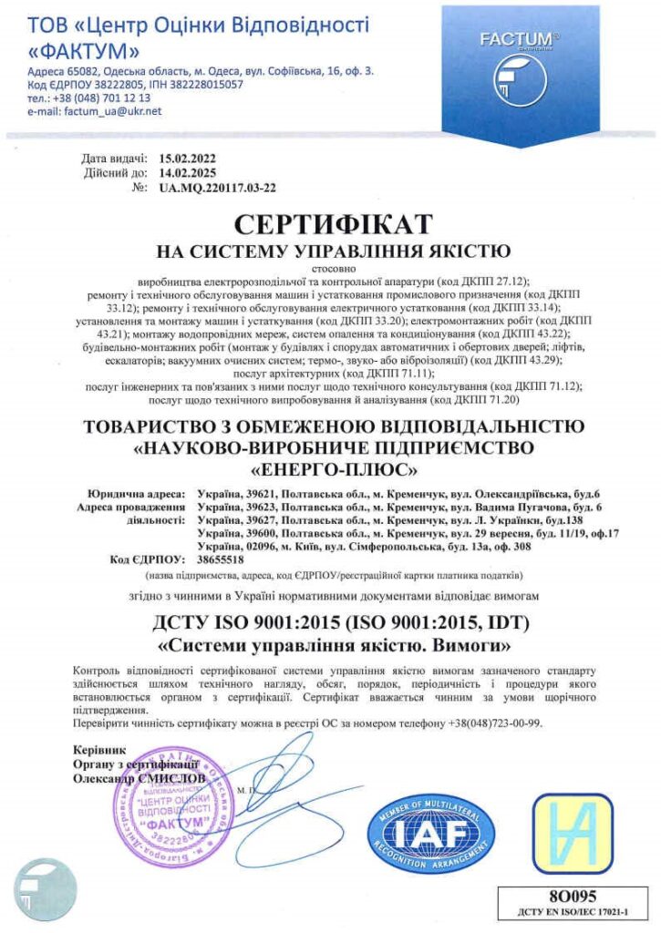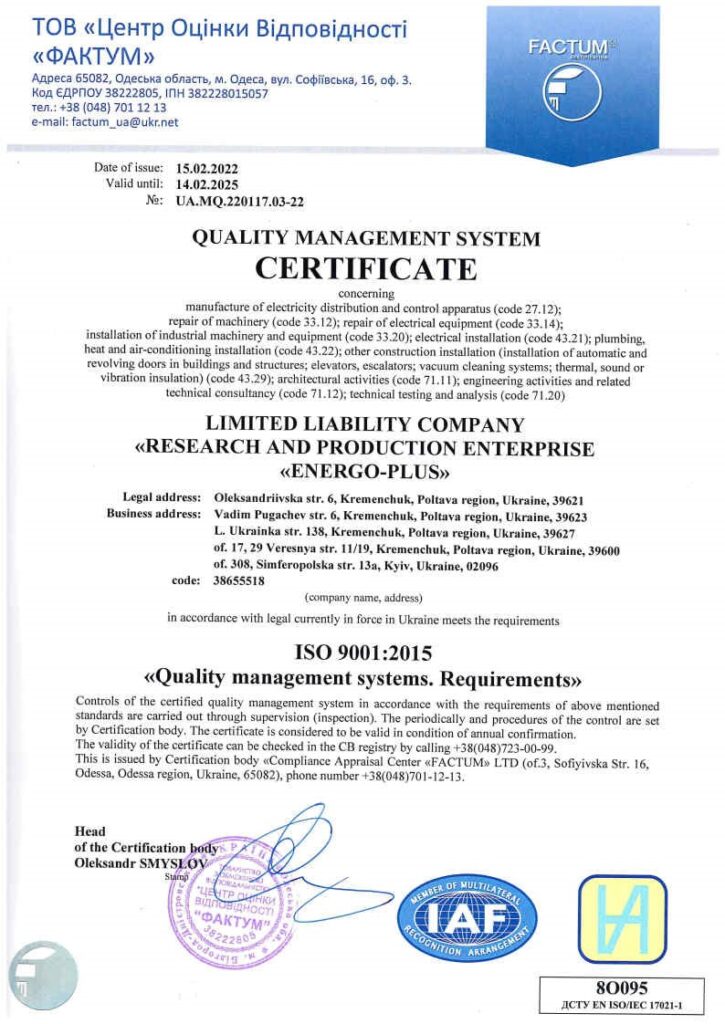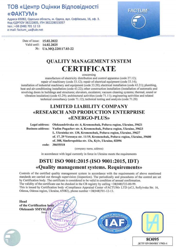 ТОВ «НАУКОВО-ВИРОБНИЧЕ ПІДПРИЄМСТВО «ЕНЕРГО-ПЛЮС» має всі необхідні сертифікати, що підтверджують належний рівень якості робіт та обладнання, що ми використовуємо у проєктах: