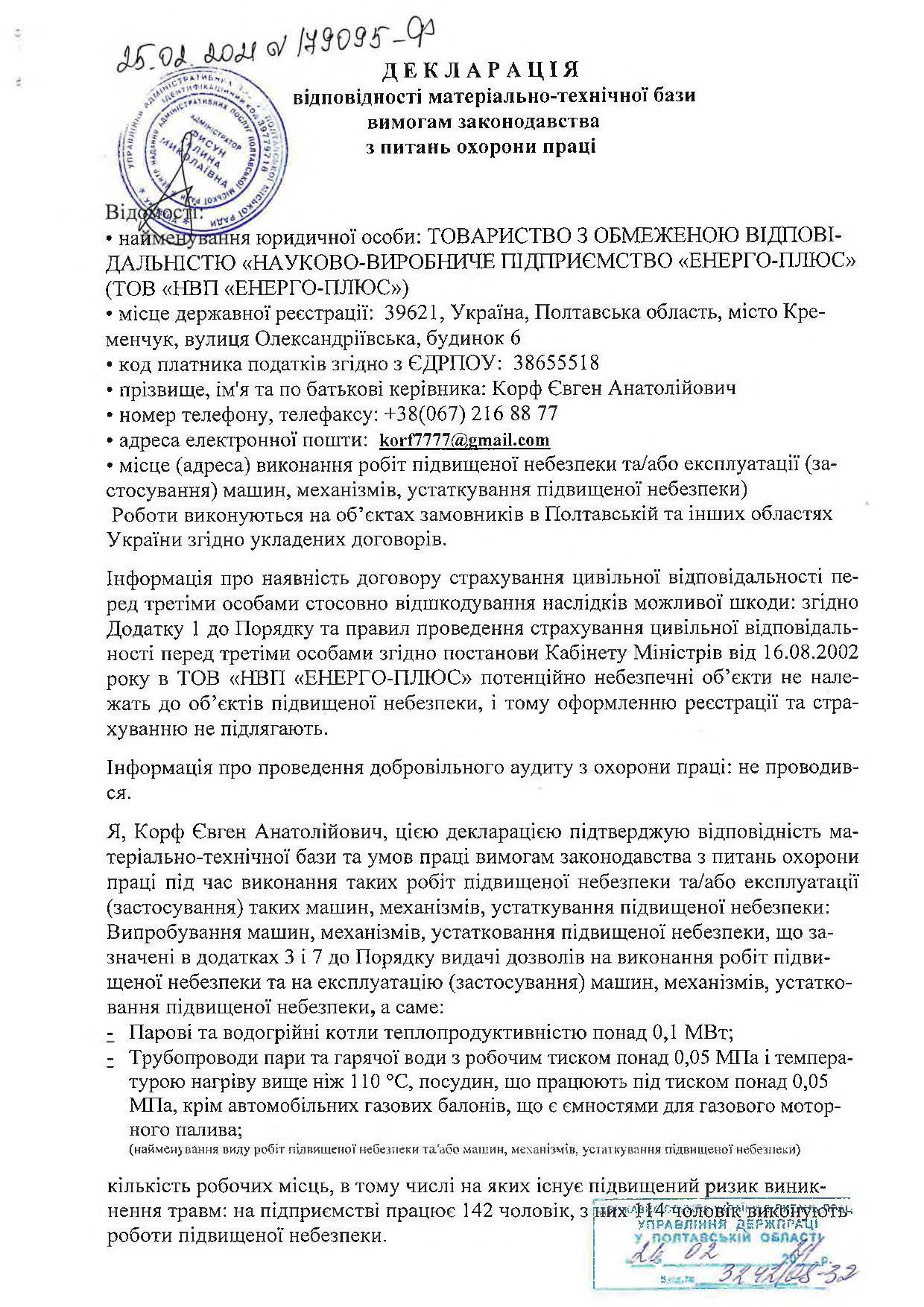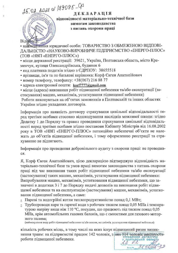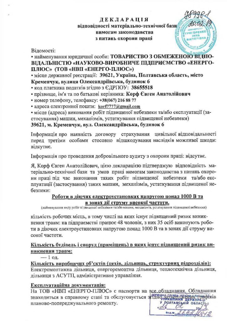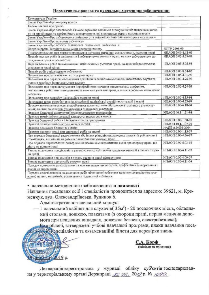 Декларація відповідності матеріально-технічної бази вимогам законодавства з питань охорони праці (зв...