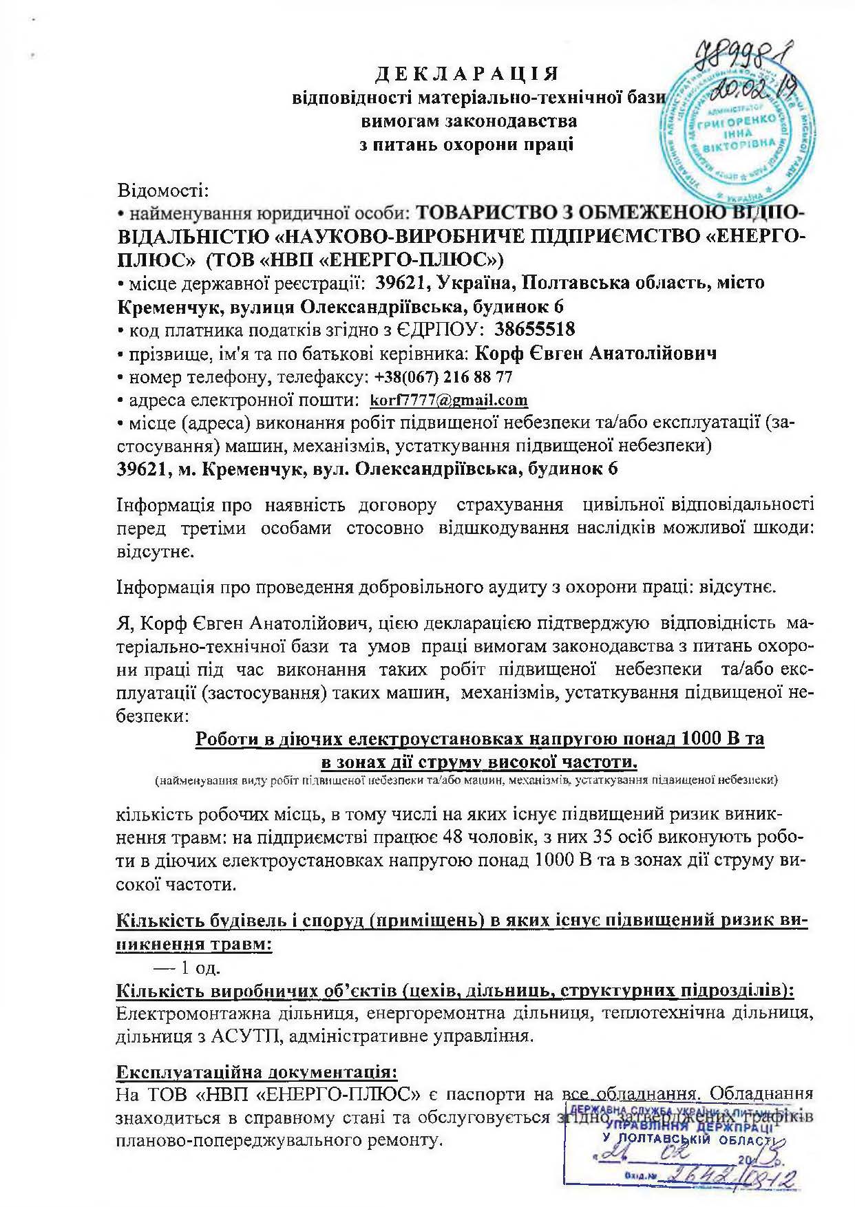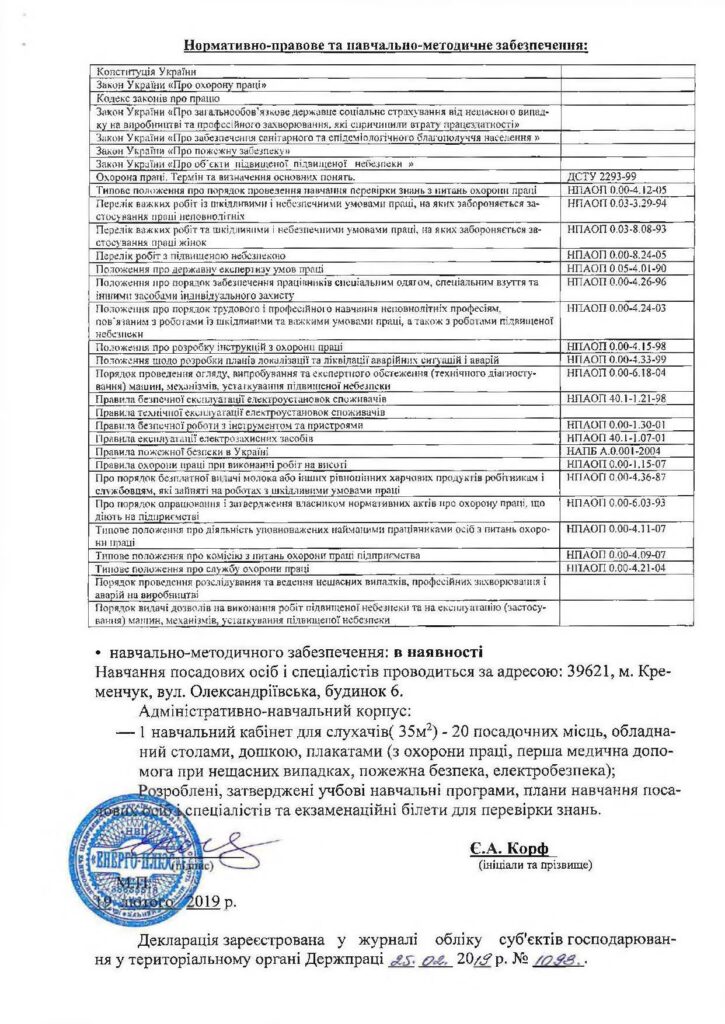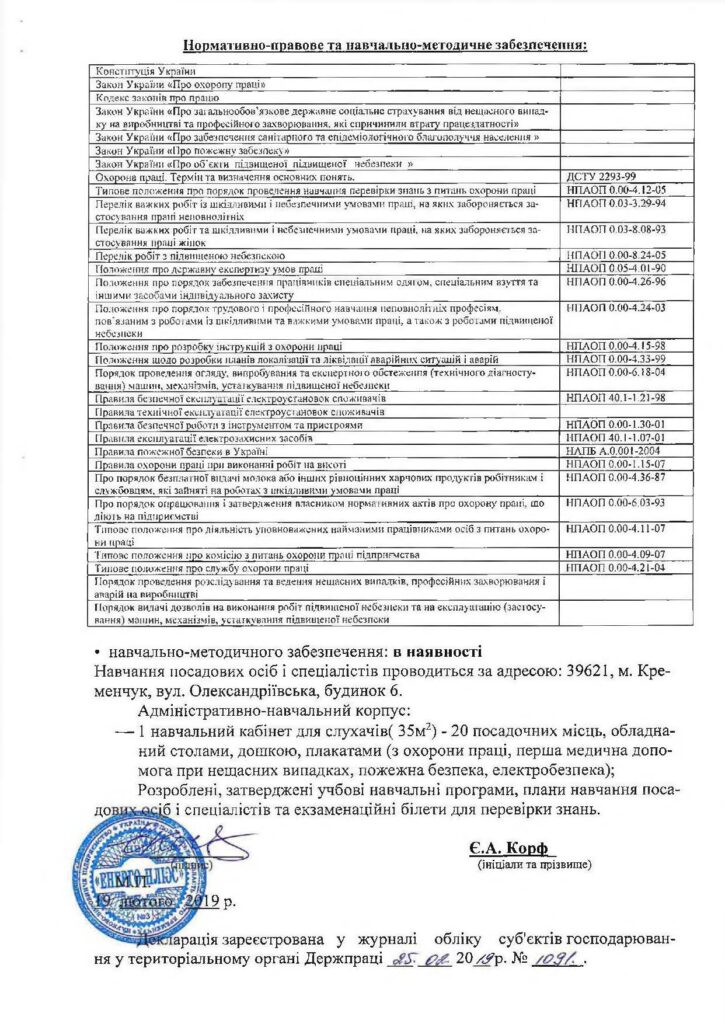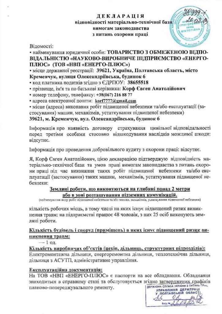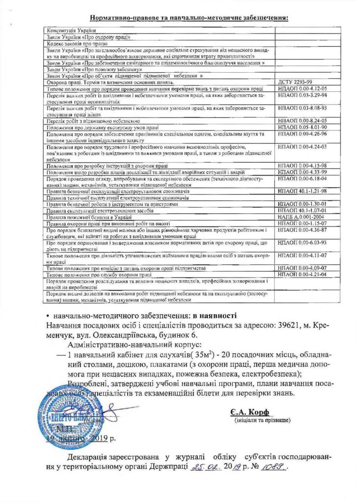 Декларація відповідності матеріально-технічної бази вимогам законодавства з питань охорони праці (зе...