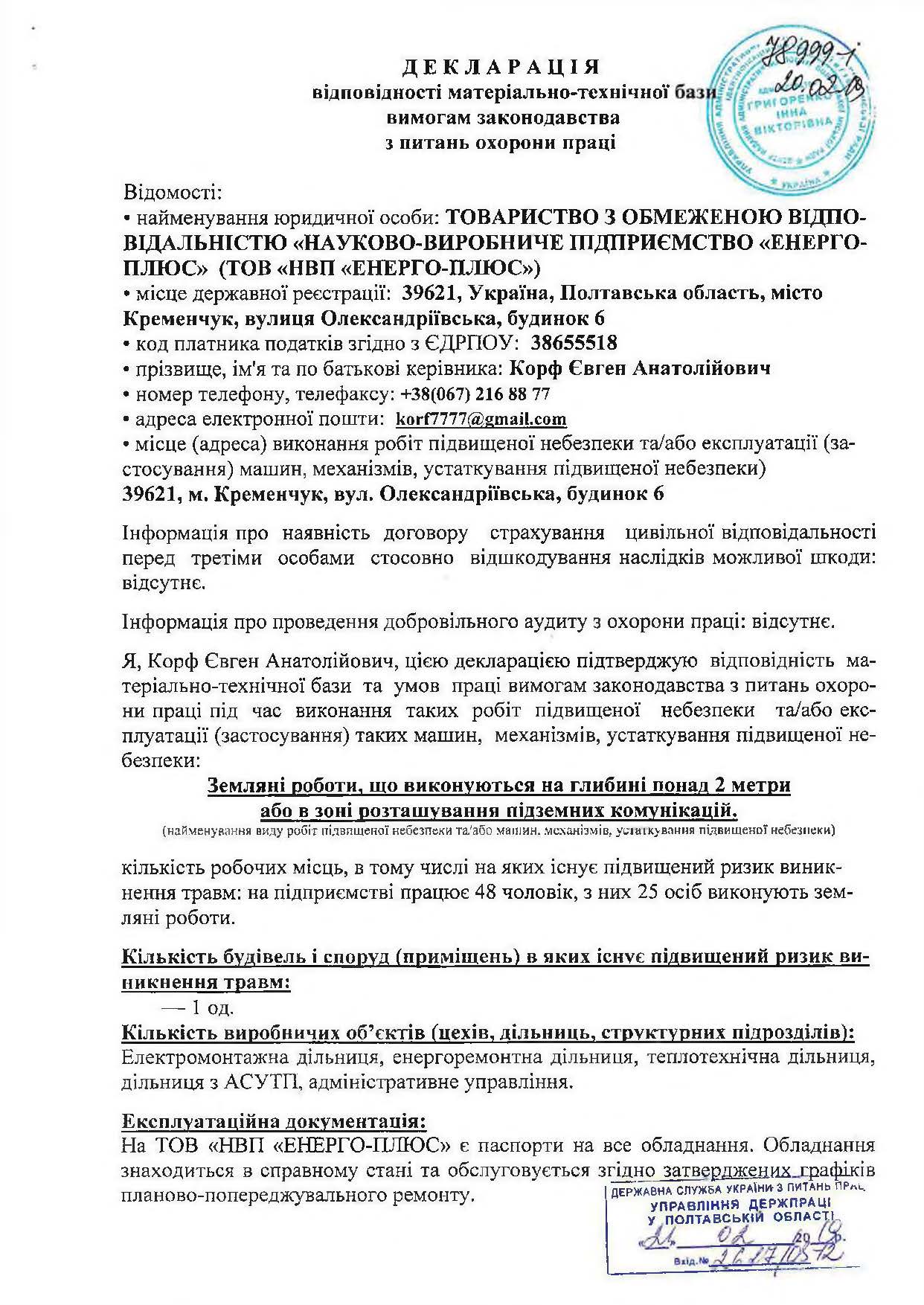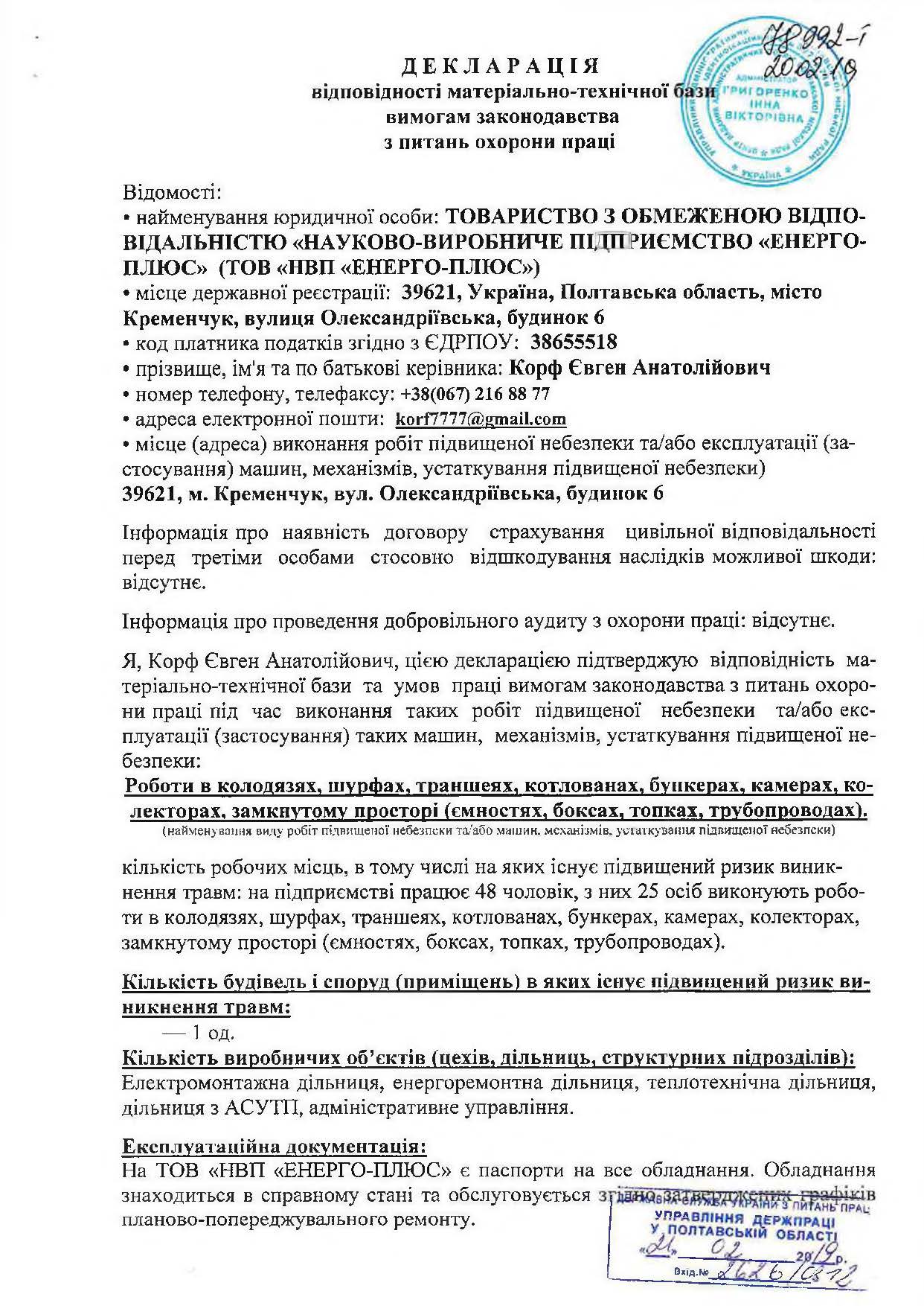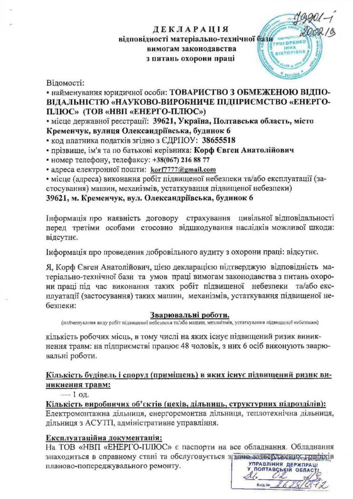 Декларація відповідності матеріально-технічної бази вимогам законодавства з питань охорони праці (ро...