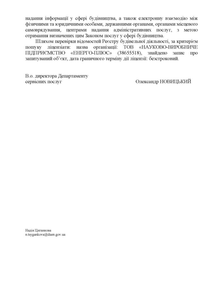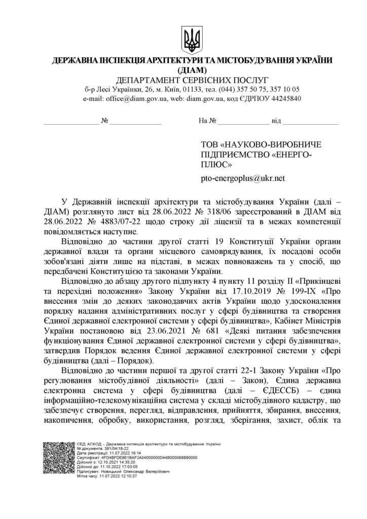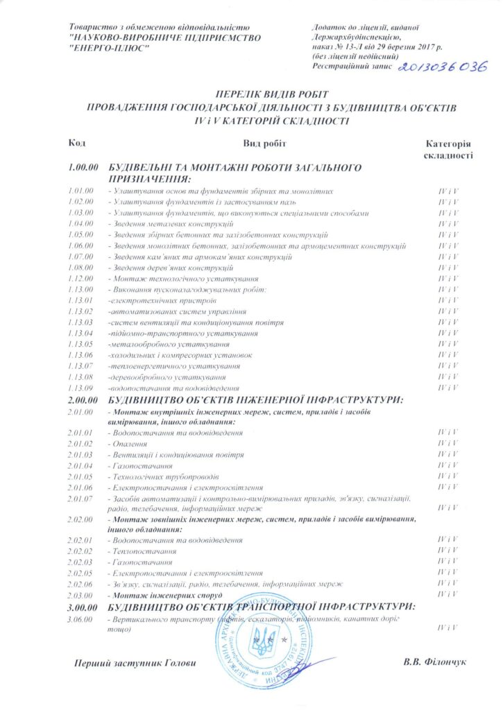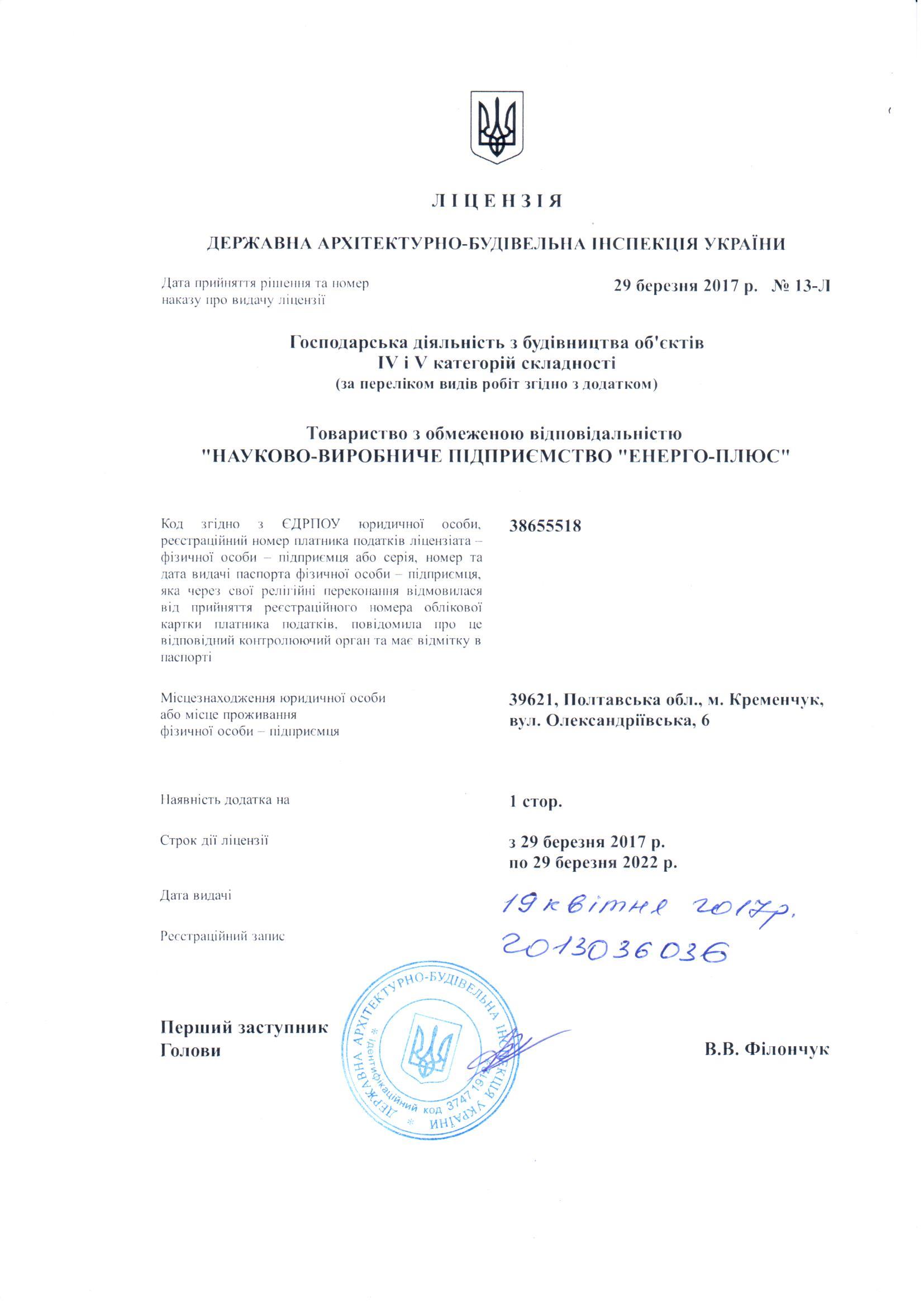 Ліцензія №2013036036 від 19.04.2017 р. видана Держархбудінспекцією